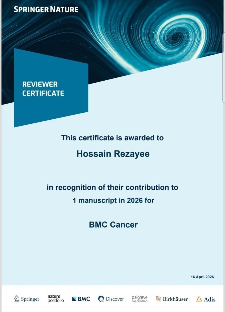 انتصاب استاد حسین رضایی بهحیث مرورگر در مجله بینالمللی BMC Cancer