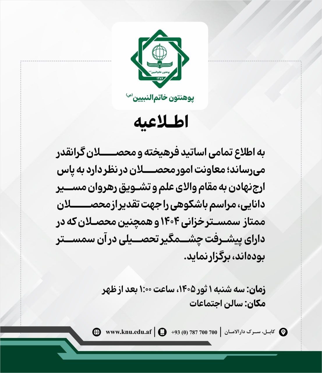 پیام ریاست پوهنتون به مناسبت تقدیر از دانشجویان ممتاز سمستر خزانی ۱۴۰۴