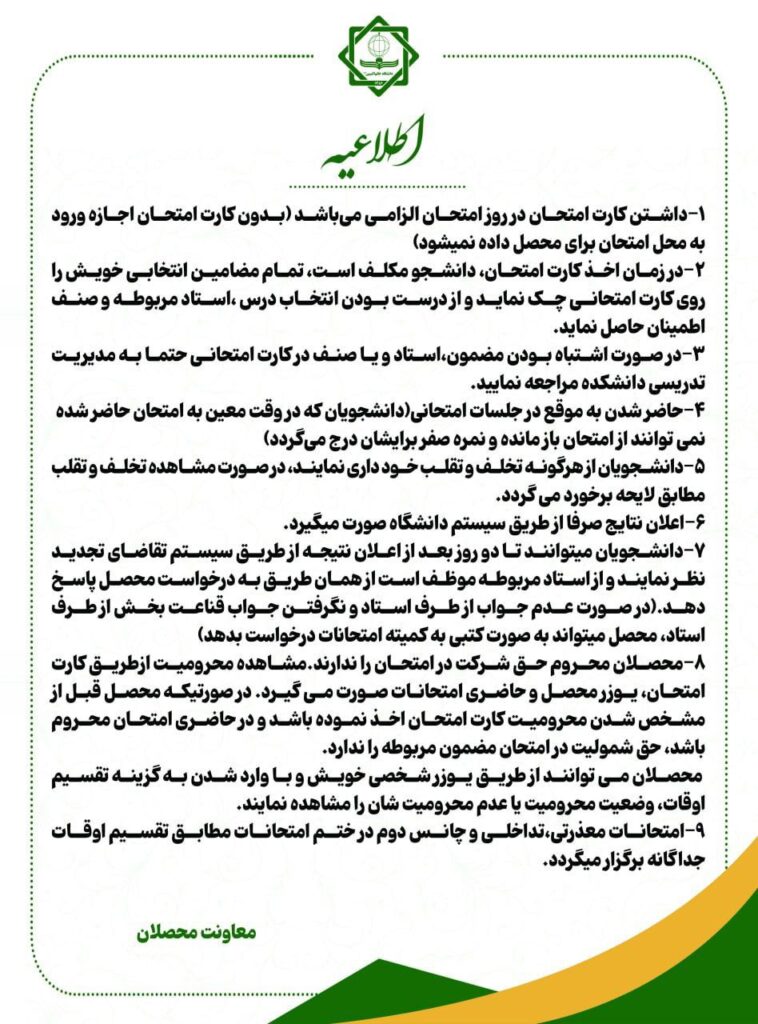 اطلاعیه امتحانات پایان سمستر