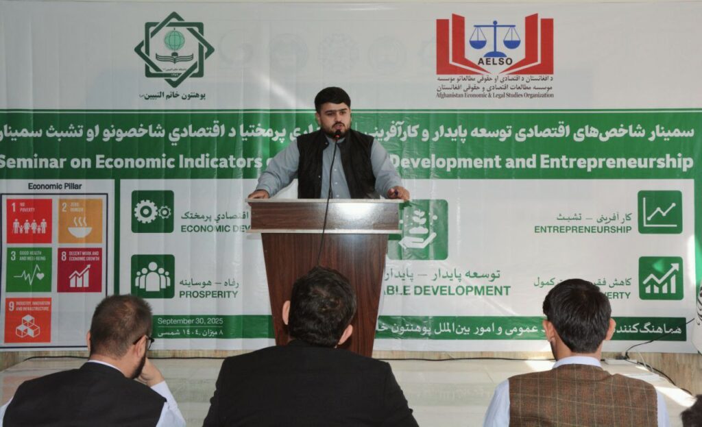 روز سهشنبه، ۸ میزان ۱۴۰۴، معاونت تحقیقات پوهنتون خاتمالنبیین(ص) میزبان برگزاری سمینار علمی مشترک با همکاری «مؤسسه اقتصادی و حقوقی افغانستان» و با هماهنگی آمریت روابط عمومی و امور بینالملل پوهنتون خاتمالنبیین(ص)، تحت عنوان «شاخصهای اقتصادی توسعه پایدار و کارآفرینی» بود. این برنامه با حضور استادان، پژوهشگران و علاقهمندان به مباحث توسعه، برگزار گردید و فرصتی ارزشمند برای تبادل اندیشهها و دیدگاهها فراهم ساخت.