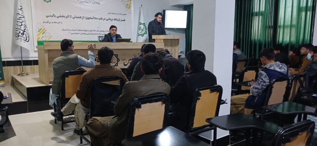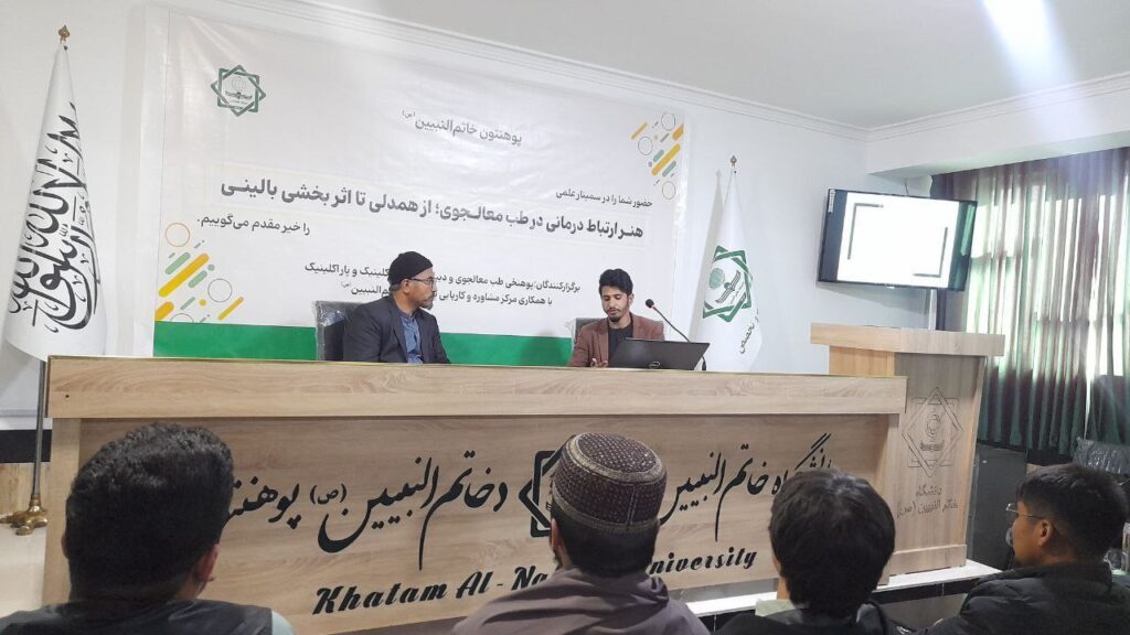 با تلاوت آیاتی از کلام الله مجید توسط یکی از محصلین سمینار آغاز شد. در ادامه دکتر محمدعالم احمدزاده از حضور اساتید، محصلان و همکاران پوهنتون خاتم النبیین(ص) تقدیر و تشکر نمودند و در ادامه راجع به ارتباط درمانی به نکات ذیل اشاره داشت: