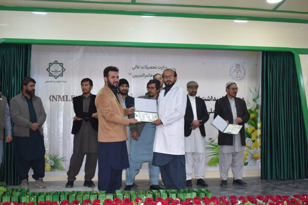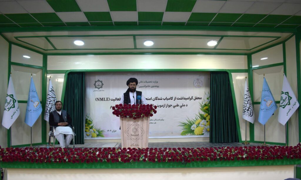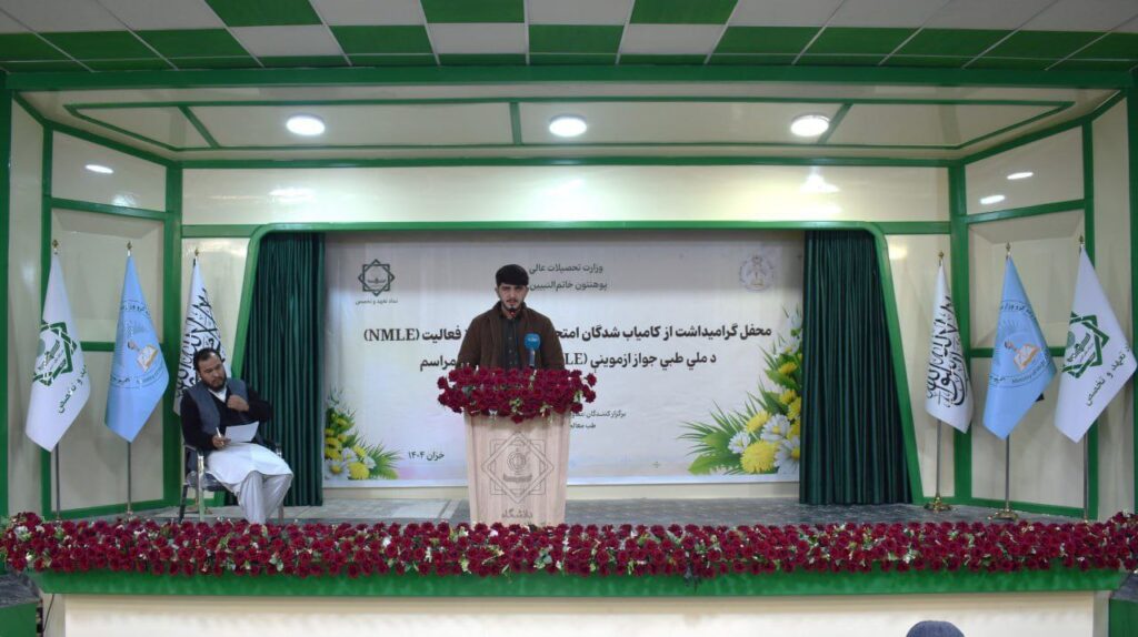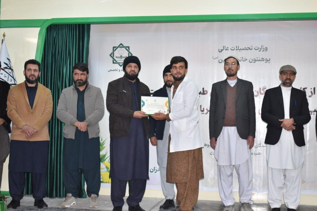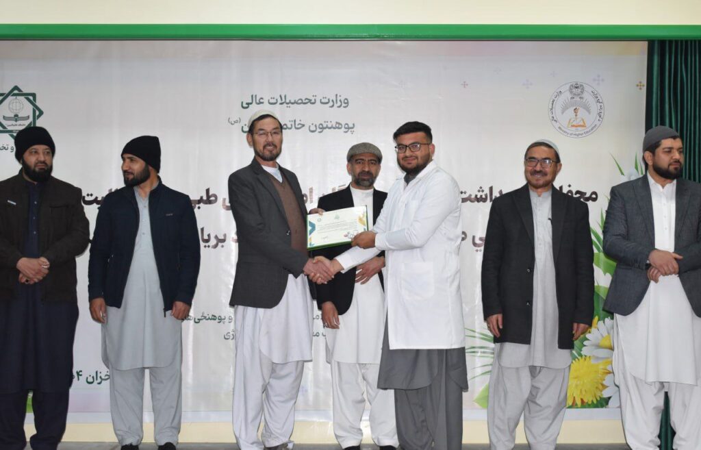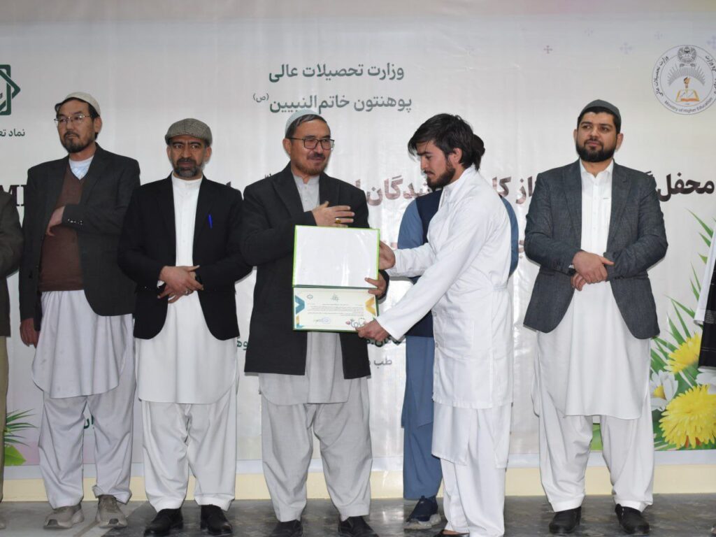 مراسم تقدیر از ۱۲۹ تن از فارغالتحصیلان رشتههای طب معالجوی و ستوماتولوژی پوهنتون خاتمالنبیین (ص) که در امتحانات ملی جواز فعالیت سال ۱۴۰۴ موفق به کسب نمرات قبولی گردیدهاند، روز پنجشنبه ۱۳ قوس ۱۴۰۴ در سالن اجتماعات اکادمیسین حضرت آیتالله العظمی محسنی (ره) برگزار شد. این برنامه به ابتکار معاونت امور محصلان و با همکاری پوهنحیهای طب معالجوی و ستوماتولوژی راهاندازی گردید و معین امور محصلان وزارت محترم تحصیلاتعالی، اعضای هیأت رهبری پوهنتون، استادان، فارغان، خانوادهها و مهمانان ویژه در آن حضور داشتند. فضای مراسم با حضور پرشور محصلان و استادان رنگ و نشاط خاصی به خود گرفته بود و شور و شعف پیروزی فارغان در تمامی بخشهای برنامه محسوس بود.