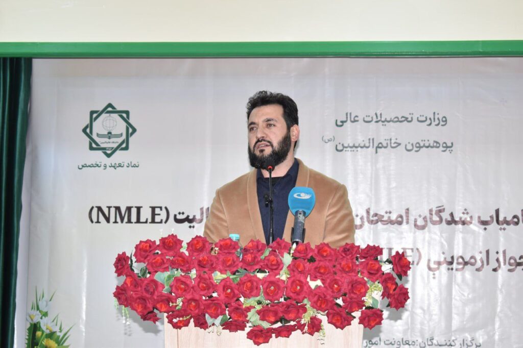 در ادامه برنامه، آقای داکتر گللاله تاجیک، اولنمرۀ امتحانات شورای طبی سال ۱۴۰۲ در رشته ستوماتولوژی، بهعنوان یکی از مهمانان ویژه سخنرانی کرد. او با بیان تجربیات شخصی خود، از نقش استادان، برنامههای تحصیلی منسجم و فضای علمی پویای پوهنتون در موفقیت تحصیلیاش قدردانی نمود.
