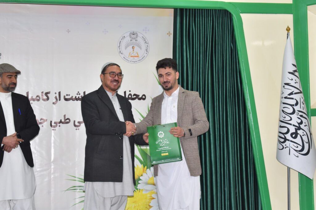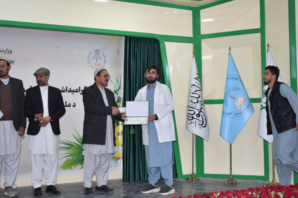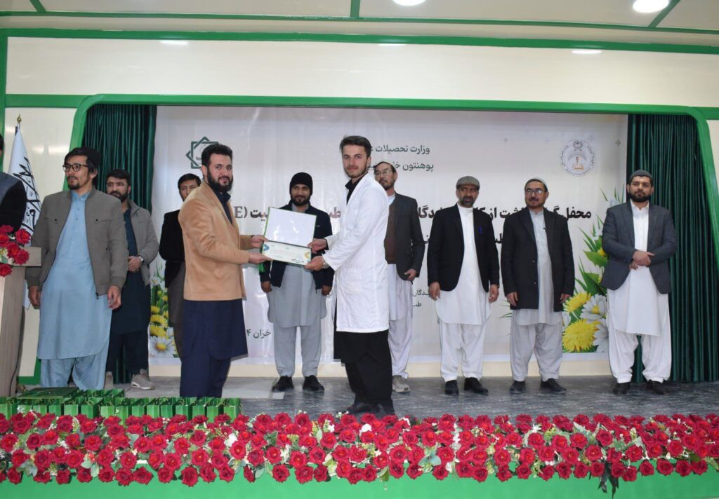 در بخش دیگر برنامه، آقای دکتر جواد کمالی به نمایندگی از فارغان طب معالجوی صحبت نمود. وی با ابراز امتنان از حمایتهای بیدریغ هیأت رهبری و استادان پوهنتون، مسیر رشد تحصیلی خود را بازگو کرده و پیشنهادهایی را در راستای بهبود برنامههای تحصیلی و افزایش فرصتهای کاریابی برای فارغان به وزارت تحصیلات عالی و وزارت صحت عامه ارائه کرد.