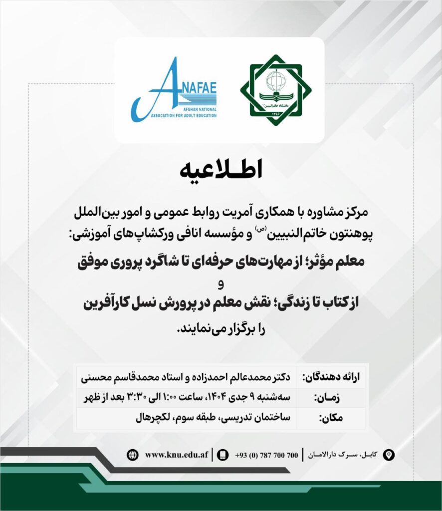 این ورکشاپ در روزهای ۲ و ۳ جدی ۱۴۰۴ از سوی پوهنځی علوم اجتماعی پوهنتون خاتم‌النبیین با همکاری پوهنځی علوم