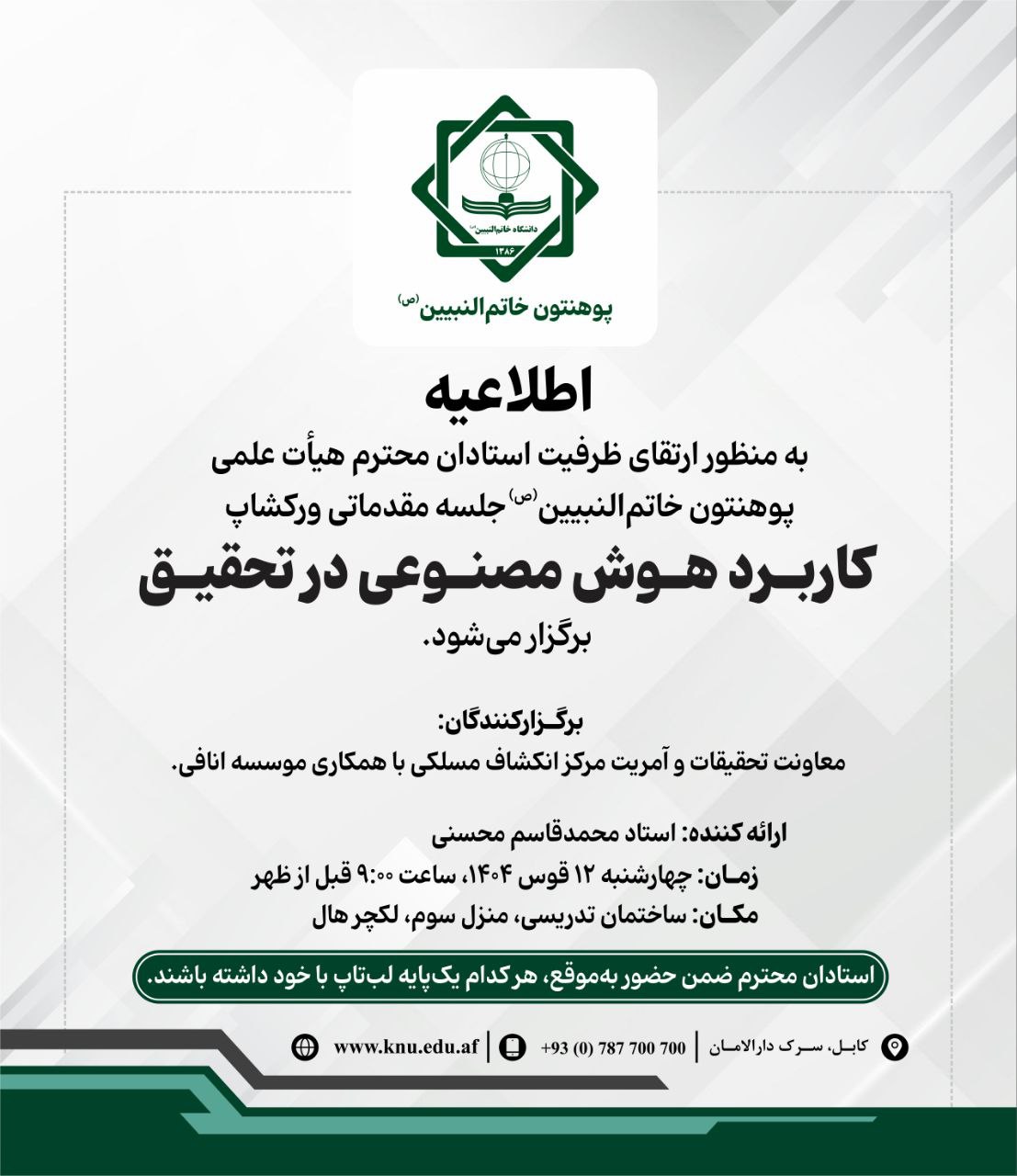 اطلاعیه جلسه نقد و ارزیابی عملکرد پوهنتون با حصور کارمندان اداری، خدماتی و امنیتی ۱۸-قوس-۱۴۰۴ 5:00 بعد از ظهر