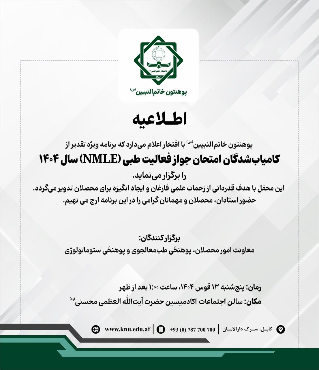اطلاعیه برنامه ویژه تقدیر از کامیاب شدگان امتحان جواز فعالیت طبی (NMLE) سال ۱۴۰۴ ۱۲-قوس-۱۴۰۴ 9:54 قبل از ظهر