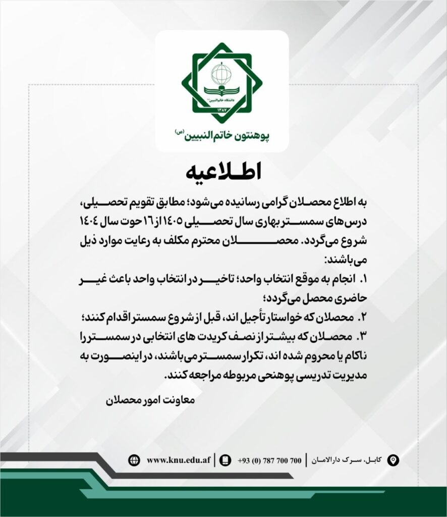 محصلان گرامی!آغاز یک فصل تازه علمی در راه است. مطابق تقویم تحصیلی، درسهای سمستر بهاری سال تحصیلی ۱۴۰۵ از تاریخ