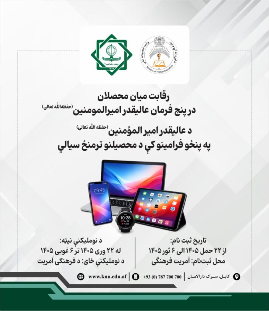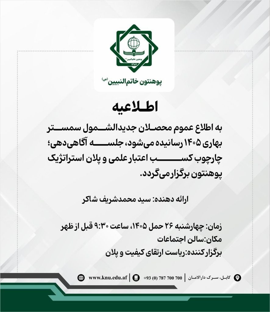 پوهنتون خاتمالنبیین(ص) معاونت امور محصلان آمریت امتحانات اطلاعیه نتایج کانکور بهاری ۱۴۰۵ برنامه ماستری به اطلاع کامیاب شدگان برنامه ماستری