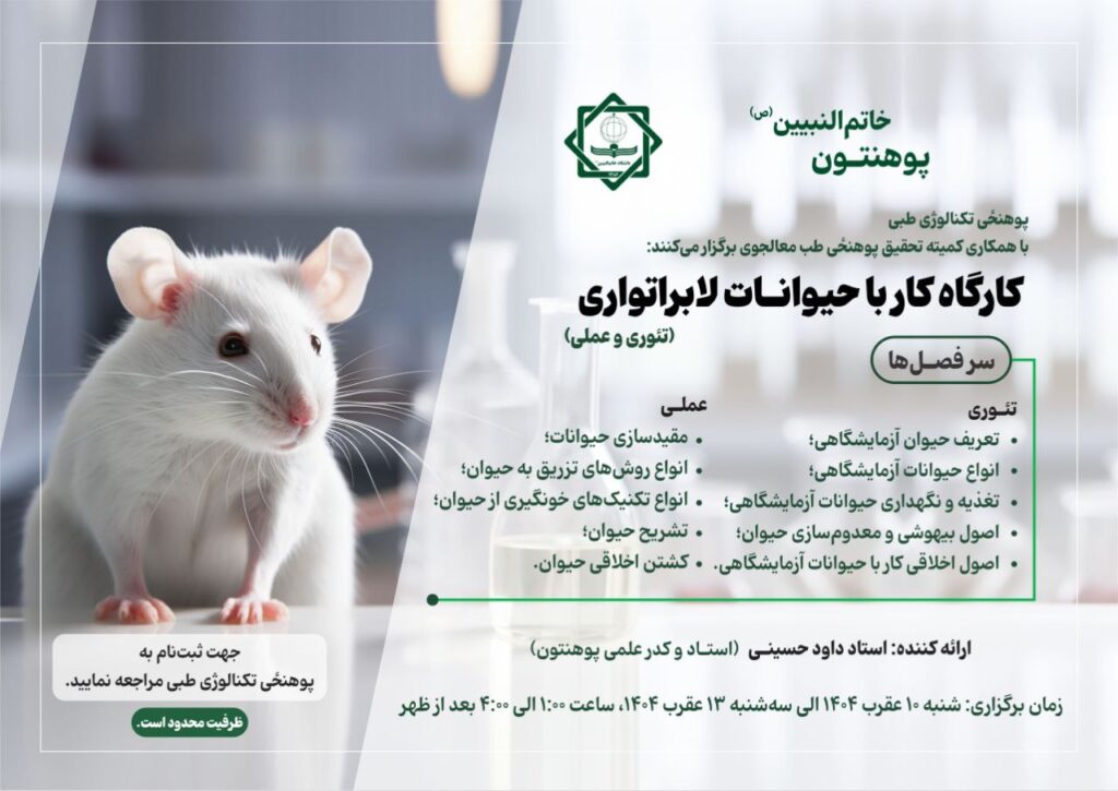 دانشکده تکنالوژی طبی دانشگاه خاتمالنبیین(ص) با همکاری کمیته تحقیق دانشکده طب معالجوی، کارگاه چهارروزهی «کار با حیوانات لابراتواری (تیوری و